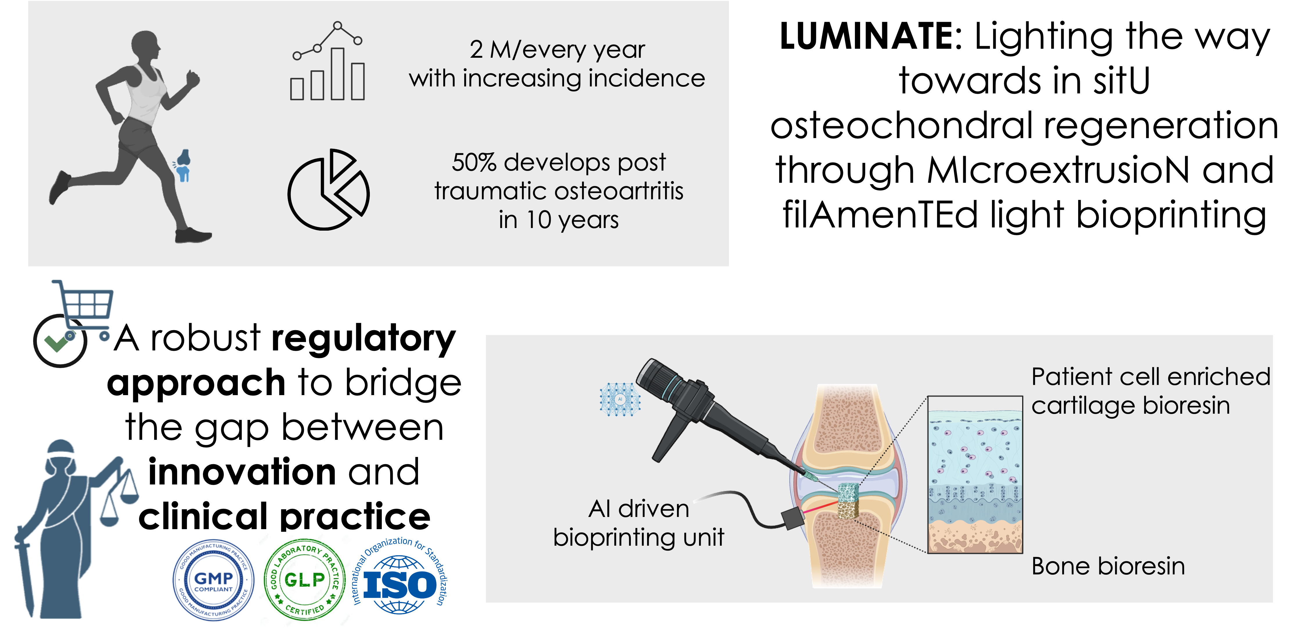 Traumatic cartilage injuries in diarthrodial joints, such as the knee, affect over 2 million people annually. Despite advances in treatment, many patients develop post-traumatic disabling osteoarthritis highlighting the urgent need for more effective solutions. The LUMINATE project proposes a one-stage, personalized treatment based on the deposition of photoresins filled with patient-derived cells through an AI driven bioprinting unit: Endoflight. The successful clinical translation of LUMINATE relies on a rigorous regulatory strategy to ensure compliance with the Medical Device Regulation (MDR), the Advanced Therapy Medicinal Products (ATMP) Regulation and AI Act: InsideAI srl participates to define such strategy. The LUMINATE bioprinting unit will require CE marking, demonstrating adherence to general safety and performance standards of MDR. The AI software for defect segmentation and material quantification is classified as medical device, requiring compliance with both MDR and AI act. From a qualification standpoint, the bioprinted constructs are regulated as ATMPs under European Medicinal Agency guidelines, due to the incorporation of viable cells aimed at regenerating damaged cartilage. When combined with a non-viable structure that provides structural support, the product is classified as a combination device. To ensure the safety and efficacy of the bioprinted constructs, biocompatibility testing will be necessary together with sterility assurance, and mechanical stability. For the cell-based components, strict GMP compliance is mandatory for cell isolation, expansion, and differentiation protocols, to ensure traceability and consistency. GLP standards will govern preclinical validation, the end point of LUMINATE project, including in vitro studies and large-animal models to evaluate the biological response, integration, and long-term functionality of the implants. To bring a medical device to market, it must undergo safety testing, preclinical trials on animals, and a series of extensive clinical studies, that are out of scope of the project. By including in the design pathway a robust regulatory approach, the LUMINATE project aims to set a new standard in personalized, minimally invasive cartilage repair, bridging the gap between cutting-edge innovation and clinical feasibility while addressing the growing medical and socioeconomic burden of post-traumatic osteoarthritis.