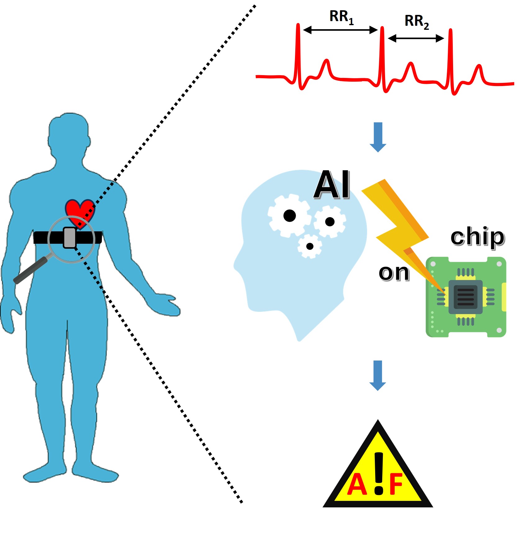 Attualmente, 4.5 milioni di persone in Europa soffrono di fibrillazione atriale (FA). Una diagnosi precoce di FA è di fondamentale importanza per garantire cure tempestive, ridurre il numero di ospedalizzazioni e favorire il risparmio sulle spese sanitarie. La FA si manifesta con eventi improvvisi e di breve durata, generalmente caratterizzati da un ritmo cardiaco irregolare, e viene diagnosticata con l’elettrocardiografia (ECG). Tuttavia, gli Holter ECG consentono un monitoraggio limitato (48 ore) che spesso non consente di rilevare la FA; i Loop Recorder, invece, consentono un monitoraggio ECG prolungato ma richiedono un intervento chirurgico per l’impianto. In questo lavoro è stato proposto un dispositivo indossabile innovativo che consente un monitoraggio continuo e a lungo termine del ritmo cardiaco e la diagnosi precoce di FA tramite approccio edge-AI. In tal modo, gli algoritmi di intelligenza artificiale sono eseguiti direttamente sul dispositivo e non su server remoti, garantendo protezione e privacy dei dati e tempi di risposta molto rapidi. Il dispositivo registra continuamente il segnale ECG e lo elabora in tempo reale per identificare i battiti cardiaci e calcolare gli intervalli inter-battito. Le serie temporali di questi intervalli vengono inviate ad un microcontrollore, su cui è implementata una rete neurale convolutiva in grado di identificare episodi di FA con un’accuratezza preliminare del 91 % ed un tempo di risposta di soli 13 ms. In caso di detezione di FA, il dispositivo produce tempestivamente un segnale di allarme, memorizza il tracciato ECG e lo trasmette al medico. Al contrario dei moderni smartwatch, il dispositivo non necessita dell’intervento del paziente per acquisire il segnale ECG, è caratterizzato da un design confortevole, ha un basso costo ed un consumo energetico estremamente ridotto, che consente un monitoraggio continuo e prolungato (diverse settimane), senza necessità di ricariche frequenti. La rete neurale integrata nel dispositivo può, inoltre, essere aggiornata ed eventualmente allenata per il riconoscimento di altre aritmie. In conclusione, il dispositivo proposto garantisce una diagnosi precoce di FA da remoto con una conseguente riduzione dei costi a carico del SSN e apre la strada verso un nuovo paradigma per la diagnostica medica improntato su un modello di medicina personalizzata e di precisione.
