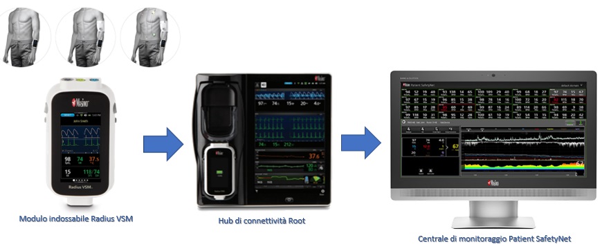 • Root, hub di connettività e monitoraggio dei pazienti che integra una serie di tecnologie, dispositivi e sistemi per fornire soluzioni di monitoraggio multimodali, in un’unica piattaforma, esso dispone n.2 Radius-VSM ad esso connessi in modalità wireless e contribuisce a semplificare i flussi di lavoro clinici automatizzando il trasferimento dati dei pazienti a sistemi di monitoraggio supplementari centralizzati e la documentazione in cartelle cliniche elettroniche;