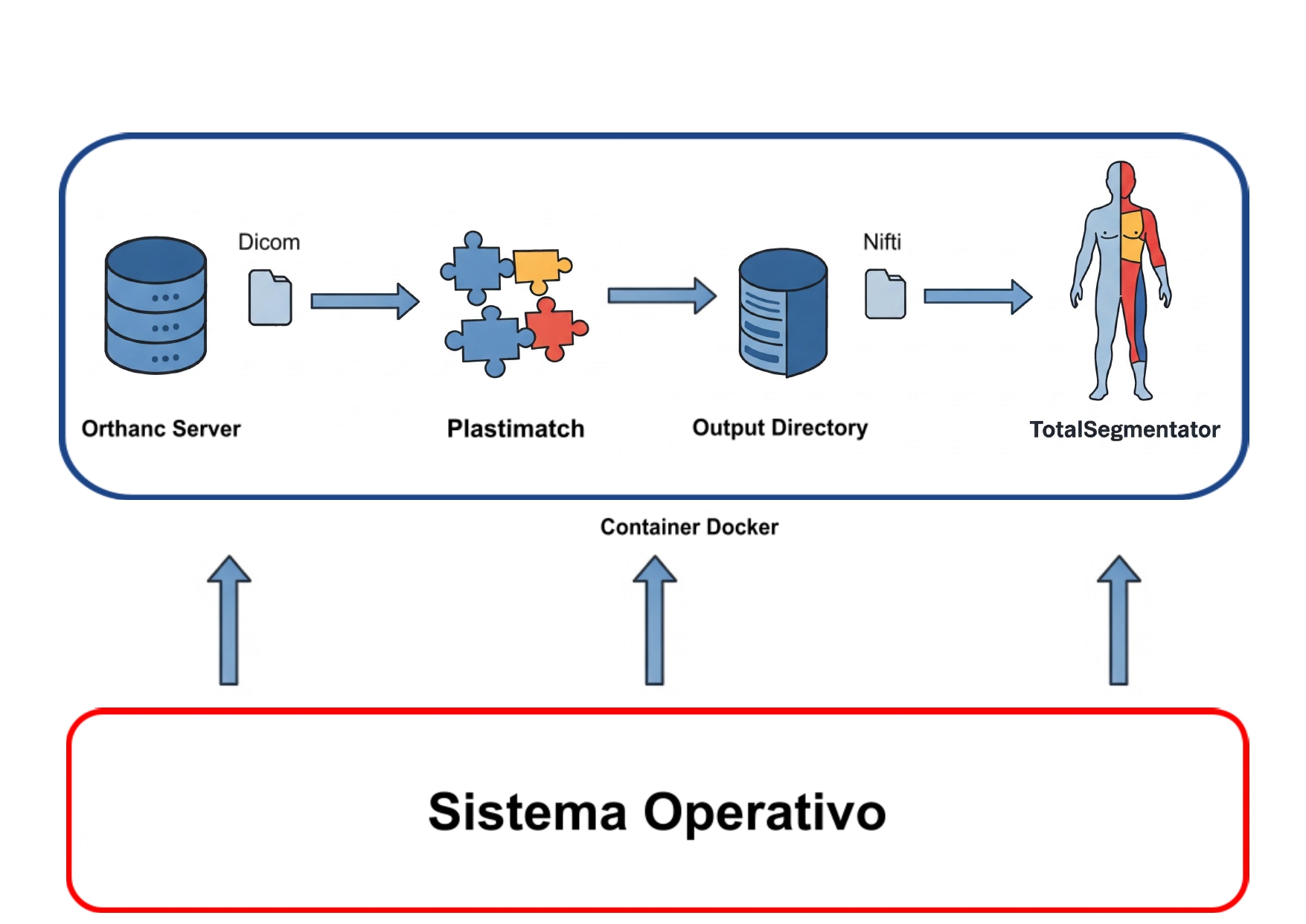 Materiali e Metodi: Il workflow implementato si basa su Docker per l’incapsulamento dell’ambiente di elaborazione. Essendo questo un lavoro in fase prototipale sono stati integrati, ad oggi, solo gli strumenti principali per l’elaborazione e l’analisi di immagini mediche. L’immagine medica può essere trasmessa dalla console clinica al container grazie alla presenza, all’interno del container, di un server DICOM open source (Orthanc). Una volta ricevuta l’immagine essa viene convertita in un formato non dicom grazie al software open source Plastimatch e successivamente segmentata automaticamente da TotalSegmentator, un software basato su AI che è rapidamente diventato uno standard nel campo della ricerca. Le segmentazioni che si possono ottenere, in modo completamente automatico, sono quelle di 117 strutture anatomiche in immagini TC e 50 in immagini MR. Una volta ottenute i contorni questi possono essere inviati nuovamente alla console clinica con eventuale valutazione volumetrica delle stesse.