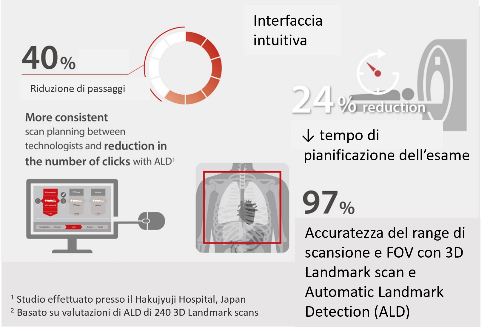 Il sistema è progettato per supportare l’attività di tecnici di radiologia, radiologi, e medici, per esami CT con flussi automatizzati, per minimizzare la dose e aumentare accuratezza e ripetibilità dell’esame. Inoltre, mira a migliorare la soddisfazione lavorativa, offrendo un’interfaccia più ergonomica e flussi di lavoro guidati, minimizzando i passaggi manuali, con benefici anche per la formazione di nuovi operatori.