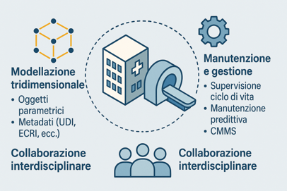 I metadati riferiti alla strumentazione elettromedicale (codici UDI, caratteristiche tecniche, documentazione a corredo del dispositivo, classificazione ECRI, requisiti impiantistici, vincoli di installazione, rapporti tecnici di manutenzione e contratto di fornitura) gestiti dai sistemi CMMS (Computerized Maintenance Management System), quando integrati nel modello BIM, permettono una rappresentazione fedele e interrogabile del parco tecnologico, facilitando la pianificazione degli spazi, il coordinamento tra progettisti e ingegneri clinici e l’interoperabilità tra dispositivi, ambienti e sistemi informativi aziendali.