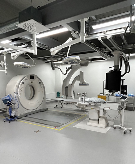 2. Sala Unica: un ambiente integrato con angiografo e TC, dove il paziente può essere trattato chirurgicamente e sottoposto a esami diagnostici senza ulteriori trasferimenti.