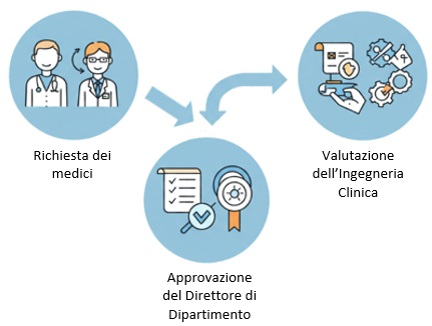 Il modello informatizzato prende in carico sia richieste in urgenza che fabbisogni programmabili provenienti dai direttori di UU.OO. Le stesse, qualora una volta approvate dal Direttore del relativo Dipartimento, giungono all’Ingegneria Clinica che ne valuta l’appropriatezza rendendole eleggibili o meno ad un ulteriore approfondimento HTA (ad esempio per tecnologie di nuova dotazione, che presentino caratteristiche di innovazione, complessità e potenziale impatto sulle scelte aziendali). Se la tecnologia richiesta è presente, consolidata e di uso corrente, non si procede a valutazione HTA, ugualmente se si tratta di un dispositivo essenziale per l’erogazione dei servizi sanitari di base (aderenza ai LEA, ai requisiti tecnologici 7301, introduzione di nuove linee guida di società scientifiche, ecc.). In tutti gli altri casi, si effettua una “valutazione preliminare HTA” tramite un’analisi multicriterio dove i criteri utilizzati, opportunamente pesati, sono valutati tramite l’assegnazione di un punteggio dai soggetti coinvolti nel processo di valutazione: il richiedente e il Direttore del Dipartimento valutano la gravità della malattia/condizione di salute, i dati di attività e l’impatto sul personale, l’Ingegneria Clinica valuta i costi di acquisizione, i costi di gestione, l’impatto su strutture/impianti e strategico.