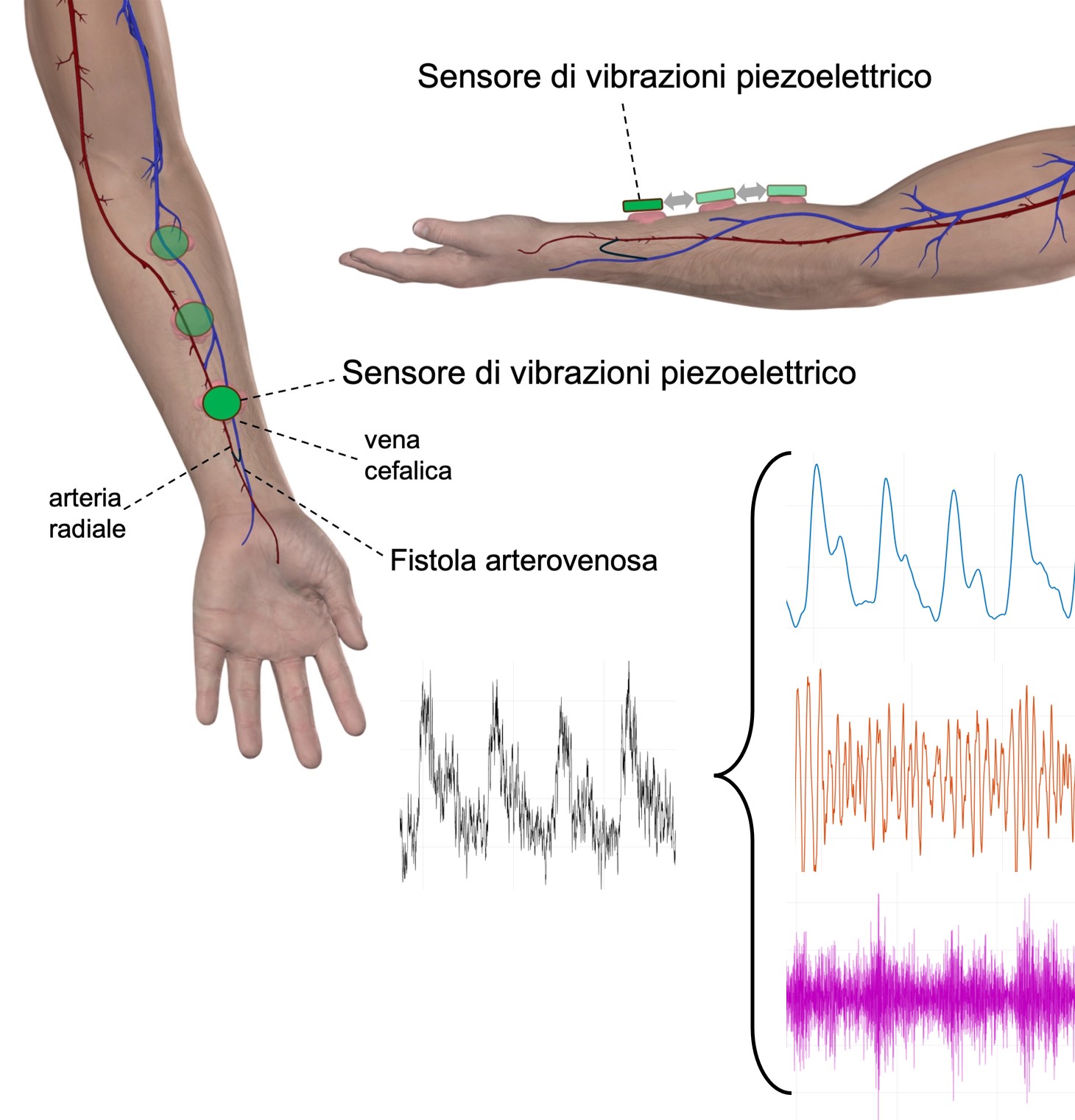 In Italia, più di 50 mila pazienti soffrono di insufficienza renale e devono sottoporsi ad emodialisi. La fistola arterovenosa (FAV) è l’accesso vascolare preferito nei pazienti con insufficienza renale terminale, e consiste nel collegamento artificiale tra un’arteria ed una vena. Tale collegamento provoca vibrazioni delle pareti venose, che possono essere percepite tramite palpazione e auscultazione, e consentono al medico di rilevare malfunzionamenti della FAV, come le stenosi. Infatti, tutte le FAV sviluppano stenosi che, se non diagnosticate e trattate tempestivamente, portano ad ospedalizzazioni, con peggioramento della qualità di vita del paziente e aumento dei costi a carico del SSN. Visite mediche più o meno frequenti comportano un grande dispiego di risorse finanziarie e umane, e in molti casi non garantiscono una diagnosi tempestiva della stenosi. È stato proposto, dunque, un sistema di tele-monitoraggio delle FAV per consentire controlli più frequenti e riconoscimento precoce delle stenosi, alleggerendo il carico sul SSN. Il sistema si presta all’uso in diversi scenari: l’automonitoraggio quotidiano in ambiente domestico, il monitoraggio frequente in sede di emodialisi, il monitoraggio da parte di personale sanitario non specializzato (medici di base, infermieri, farmacisti). Il sistema si basa su un sensore di vibrazioni piezoelettrico che registra contemporaneamente pulsazione e vibrazioni palpabili e udibili della FAV, ed estrae diverse feature che vengono poi utilizzate da un algoritmo di intelligenza artificiale per la diagnosi della stenosi. I dati possono essere trasmessi al personale medico ed utilizzati per migliorare la gestione del paziente. Nei test preliminari, il sistema ha consentito la diagnosi di stenosi con accuratezza del 92 %, sensibilità del 85 %, e valore predittivo positivo del 100 %, garantendo un’elevata probabilità di diagnosi precoce della stenosi da remoto. Il sistema di tele-monitoraggio della FAV apporterebbe numerosi vantaggi, in quanto consentirebbe di migliorare la qualità di vita dei pazienti, riducendo la necessità di recarsi spesso in clinica e di fare lunghi spostamenti, e al contempo di ridurre le ospedalizzazioni, le liste di attesa per i controlli, e i costi a carico del SSN. La sua semplicità di utilizzo lo rende adatto all’uso da parte di personale sanitario non specializzato, e di elevata accettabilità anche da parte dei pazienti per scopi di automonitoraggio.