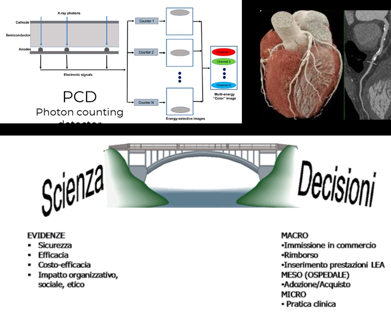 La tecnologia TC Photon-Counting (PCD-CT) è una rivoluzione in ambito radiologico. Ad oggi in letteratura non emergono molti studi di analisi multidisciplinare. Si è così deciso di procedere con un Rapid Report HTA, in base al Core Model di EUnetHTA incentrato nella gestione dei cardiovascular diseanses (CVD). Ad oggi, la CVD in Italia è una tra le patologie più rischiose. Il gold standard riconosciuto dalle Linee Guida ESC 2024 è la coronarografia (ICA), ma emerge sempre più la necessità di sostituire la ICA nel ruolo di diagnosi e non di trattamento, con una procedura non invasiva, abbattere il sovra-utilizzo. I vantaggi tecnici sono, riduzione del rumore elettronico, ridotta risoluzione spaziale (0,11 mm in UHR), risoluzione temporale pari a 66 ms, spectral imaging, riduzione degli artefatti da movimento, di blooming e beam-hardening. Gli svantaggi sono nell’ampio spazio di archiviazione PACS e nei costi elevati di adeguamento impiantistico, nonché nell’elevato investimento sulla formazione. In termini di sicurezza del paziente, gli studi clinici suggeriscono una riduzione della dose del 43-50% con mantenimento della qualità dell’immagine, soprattutto nei pazienti obesi. Inoltre, si dimostra una riduzione del 20%-25% del volume di mdc iodato, nonché la possibilità di alternativi mdc non iodati. Altresì, un abbattimento dei rischi correlati alla procedura mininvasiva e una riduzione del rischio radiologico per l’operatore. In termini di efficacia clinica, si evidenzia il miglioramento nella caratterizzazione delle placche arterosclerotiche, con stimato il 30% delle ICA evitabili grazie alla PCD-CT. Il costo di ammortamento secondo un’analisi di clinical costing è molto elevato rispetto la TC 64 slices single source. Si deve però tenere conto di numerosi introiti, quali, esami svolti, risparmi sul mdc e per la cessazione di procedure ICA non necessarie (minor gestione del paziente, dispositivi non più necessari, equipe clinica non necessaria, abbattimento dei tempi dell’esame), nonché aumento del numero di esami per maggiore velocità di acquisizione. Si conclude che, la PCD-CT è una tecnologia innovativa la cui introduzione in una realtà ospedaliera deve essere svolta con coscienza e con prospettiva di cambiamento nelle procedure sanitarie nonché cliniche tenendo ben presente i costi e ricavi in riferimento alla propria realtà ed al grosso investimento tecnologico sostenuto, in un’ottica di sostenibilità aziendale.